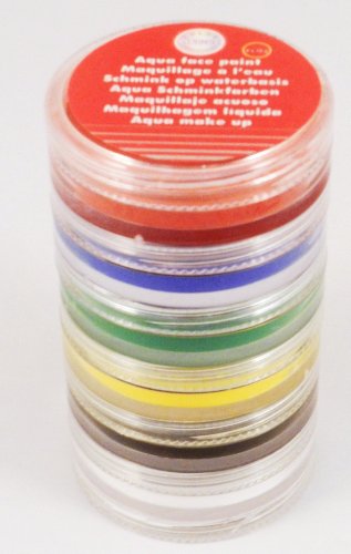 Este lote de maquillaje contiene 6 colores: rojo, azul, verde, amarillo, negro y blanco. Este maquillaje acuoso se quita fácilmente con agua y jabón. Este lote es ideal para Carnaval o para cualquier otra ocasión.