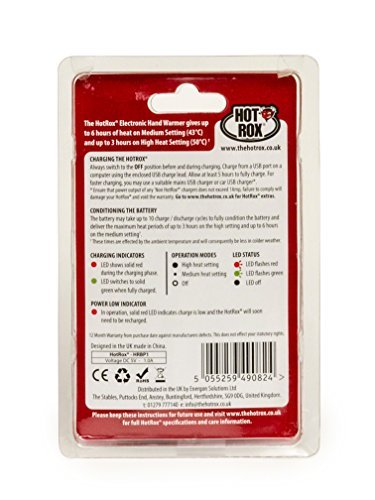 - HotRox Electrónica calentador de manos y USB lead, este práctico versión se pueden cargar desde cualquier cargador USB 5 V, por lo que de un ordenador portátil, PC, un cargador de coche USB o un cargador USB con adaptador de alimentación (compró tradicional juego.).