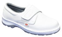 Zapato de microfibra con cierre de velcro. Modelo Milán. Nivel de protección SRS+01+F0. Certificado CE, Clase I, Categoría II. Color blanco.