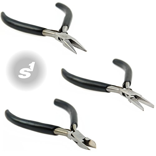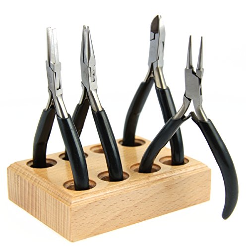 4 alicates de relojero S1 Micro sobre zócalo de madera genuina. Composición: 1 alicate de punta plana, 1 alicate de punta media caña, 1 alicate de punta redonda y 1 alicate de corte lateral.
