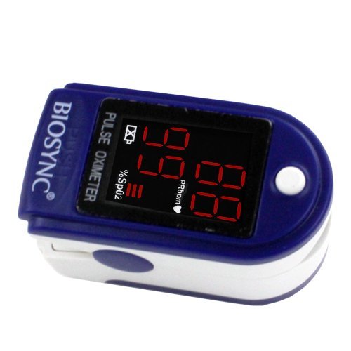 Biosync Pulsioxímetro y monitor de frecuencia cardíaca con las instrucciones en inglés, alemán y francés, cordón y bolsa de transporte - azul oscuro o negro