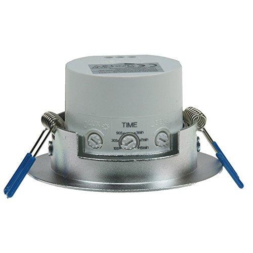 Detector de movimiento integrado. Gracias a su rango de actuación de 6 m y su altura máxima de montaje de 2,5 m, es apto para iluminación en habitaciones pequeñas, pasillos, zonas de paso o baños. Fácil de instalar en el techo.- Fabricado en aluminio - Fijación con pasadores - Tensión: 230 V - min. 10 W: apto para ledes. - máx. 1200 W - Alcance: 6 m, altura de montaje recomendada 1,8-2,5 m - Grosor de montaje: aprox. 68 mm - Profundidad de montaje: aprox. 50 mm - Exterior: aprox. 84 mm - Duración: de 10 segundos a 7 min - Sensibilidad ajustable: 3-2000 lux.