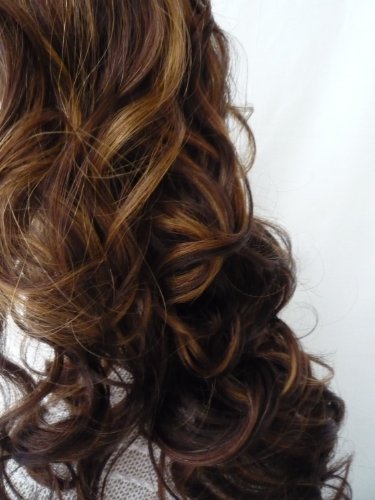 - El color que se muestra es color 6h27h30 - castaño cálido oscuro mezclado con tonos suaves dorados y miel y toques de color rojizos. El estilo es ondulado-Extra largo.
