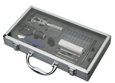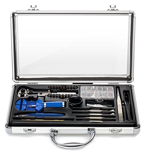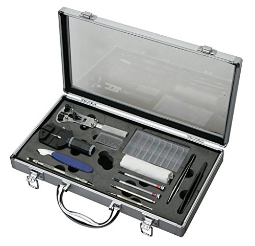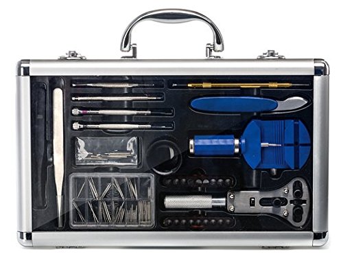 - Herramienta relojero fijado en caja de aluminio exclusiva Para cambiar las correas de reloj Para facilitar la sustitución de pilas de reloj Ideal para pequeñas reparaciones Se entrega en una caja de aluminio exclusivo con ventana