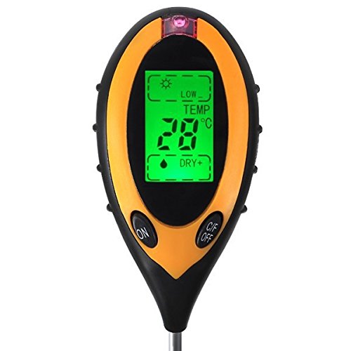 - Tiene un 200mm sonda sensible y sensor de luz ventana ofrece 5 unidades de exacta y precisó resultados medidos, Ph, la humedad, la luz del sol, ° C y ° F (Suelo y medio ambiente). además de las funciones, sino que también tiene una pantalla LCD de gran tamaño con pantalla en blanco, retroiluminación y apagado automático.