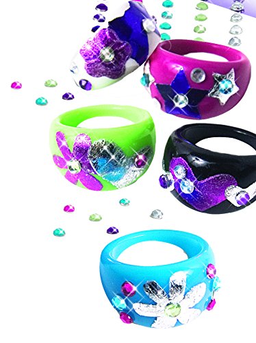 - Descripción del producto: Decora y personaliza sus 5 anillos! Contiene: 5 anillos de plástico, etiquetas engomadas, 3 hojas de transferencia de apariencia metálica (rosa, púrpura y plata) y 1 rhinestones de placas. Instrucciones ilustradas en color. A partir de 8 años.