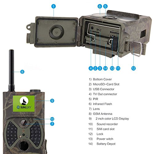 SUNLUXY® HC-300M Cámara de Caza 12MP HD con GSM/MMS/GPRS/SMS Pantalla TFT de 2 pulgadas Seguimiento infrarrojos Digital + Tarjeta SD de 4GB